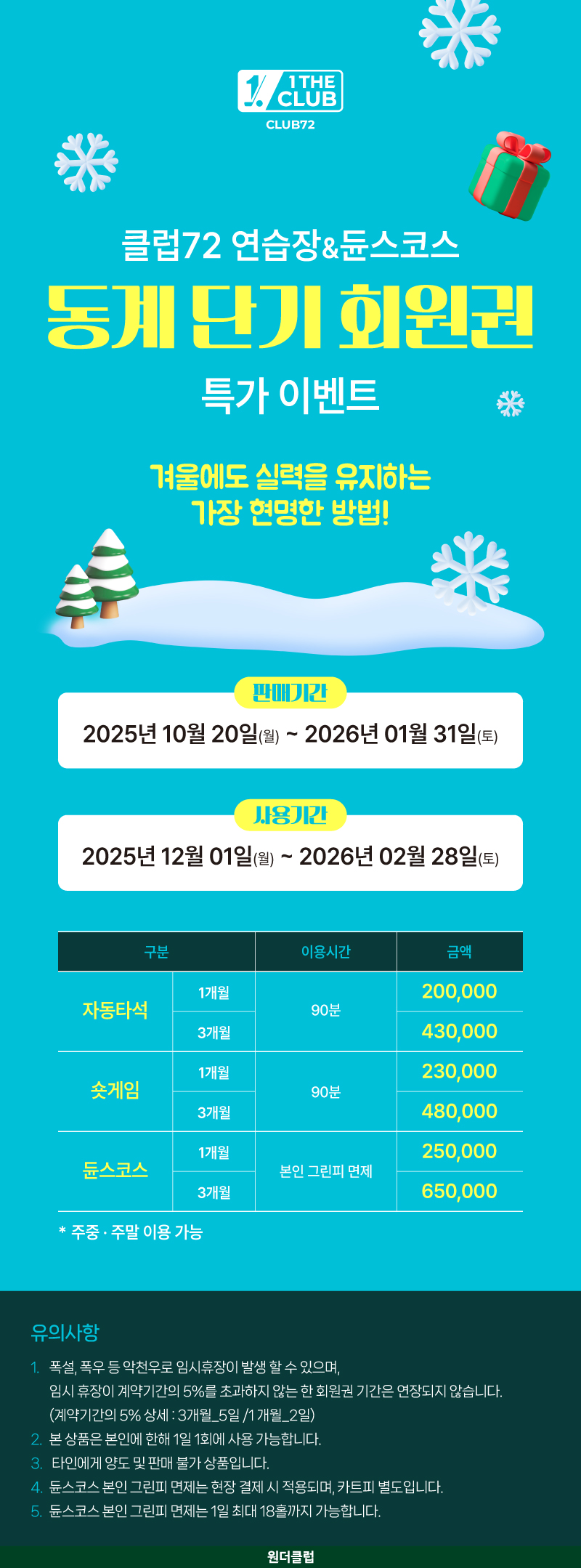 제목[클럽72] 동계 단기회원권 특가 이벤트 2025-10-17 01:10:27