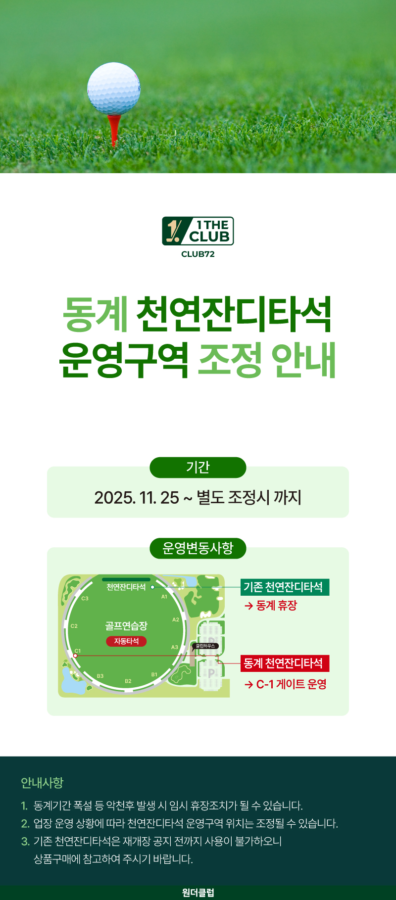 제목[클럽72] 골프연습장 동계 천연잔디타석 운영구역 조정 안내 2025-11-28 03:11:50